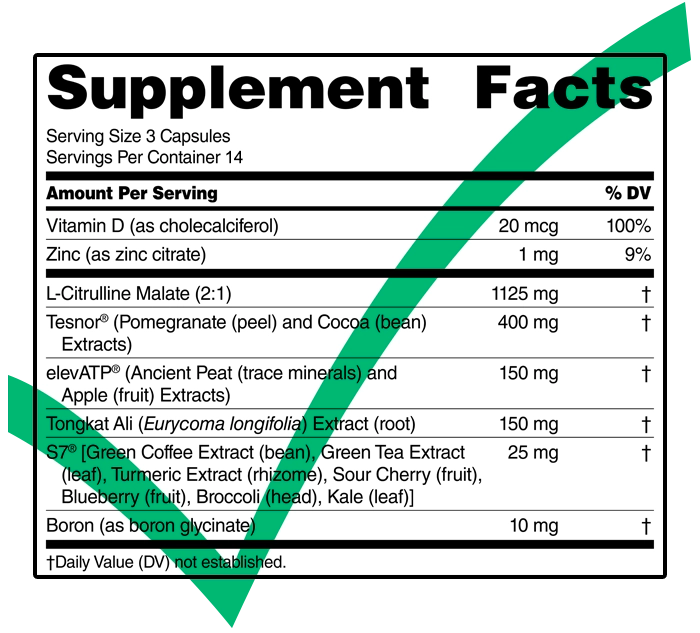 The real MVP of our formula, Tesnor is a clinically-validated blend of cocoa bean and pomegranate peel extracts that increases free and total testosterone in aging men. In clinical trials, men taking 400 mg of Tesnor daily saw huge boosts in their overall energy and felt noticeably stronger and leaner.